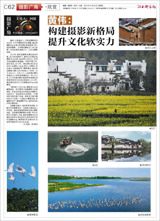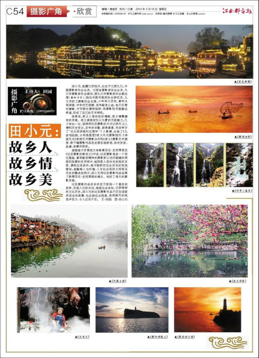 九江摄影网讯(田园) 4月18日和25日,《江南都市报》C54版、C62版摄影广角·欣赏专版全彩版分别刊登了中国摄影家协会会员、江西省摄影家协会会员、九江市摄影家协会顾问、原九江市摄影家协会副主席(兼秘书长),现任九江市职工摄影协会主席田小元,江西省摄影家协会会员、九江市摄影家协会理事、德安县摄影协会主席黄伟的摄影艺术作品选登专栏《田小元:故乡人,故乡情,故乡美》、《黄伟:构建摄影新格局 提升文化软实力》。本网特予以转载。