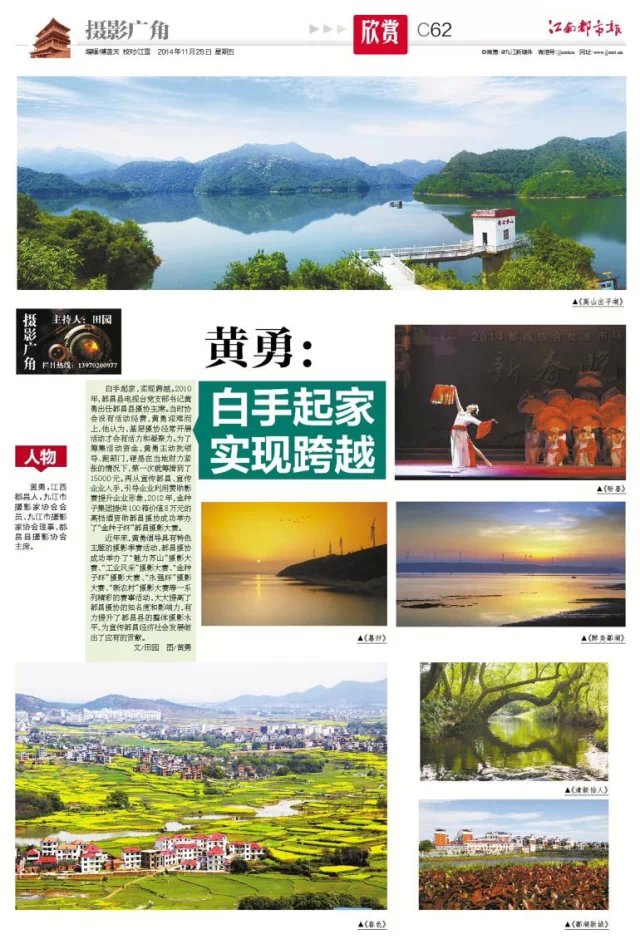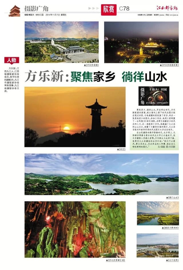 九江摄影网讯(田园) 11月7日和11月28日,《江南都市报》C78、C62版摄影广角·欣赏专版全彩版分别刊登了江西省摄影家协会会员,新华社签约摄影师,九江市摄影家协会常务理事,九江县摄影协会主席方乐新和九江市摄影家协会会员、九江市摄影家协会理事、都昌县摄影协会主席黄勇的摄影艺术作品选登专栏《方乐新:聚焦家乡 徜徉山水》《黄勇:白手起家 实现跨越》。本网特予以转载。