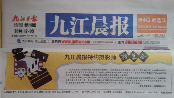 九江摄影网讯 《九江晨报》是一份贴近市民生活的都市类报纸,一向注重版面的视觉呈现,以及对于图片的使用。九江摄影氛围浓郁,拥有众多的摄影大家与爱好者,为了促进九江摄影事业的发展,让摄影人有一个良好的练习和展示平台,也为了让《九江晨报》拥有更加丰富的图片视觉,《九江晨报》现面向全市招募特约摄影师。 只要你热爱摄影,拥有一台相机,并订阅一份《九江晨报》(仅98元),就可报名参加。成为晨报的特约摄影师后,会颁发特约摄影师证,拍摄的优秀作品优先刊载。《九江晨报》已与市摄影家协会达成协议,刊发图片可作为市摄协入会条件。《九江晨报》每个月开辟一个专版,用于刊登摄影师的作品。照片一经见报,即付稿酬。 报名咨询电话:15079220731 联系人:刘家