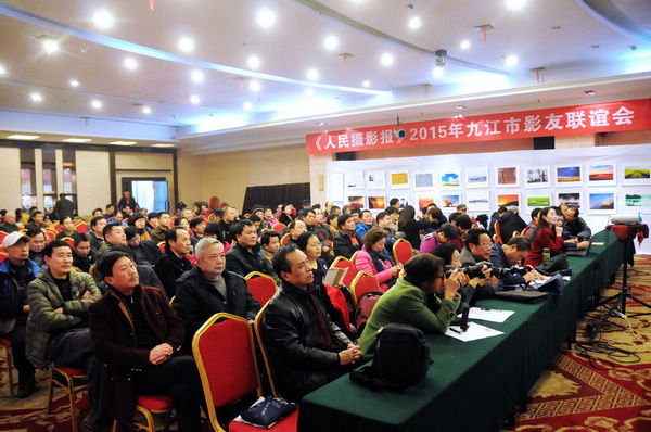 九江摄影网讯(沈双武)为增进《人民摄影》报与九江市摄影组织、广大摄影爱好者之间的联系与沟通,为影友创造学习交流的机会,宣传和推动摄影艺术的发展,挖掘和推介优秀摄影人才与摄影作品,3月15日下午,九江市摄影家协会、《人民摄影》报在九江金誉国际大酒店共同举办《人民摄影》报2015年走进九江影友联谊会活动。江西日报九江分社副社长燕平、九江市摄影家协会主席宋小勇,副主席蔡杰、杨青、罗匡龙等出席,与200多位九江摄影爱好者共同参加了联谊会活动。 《人民摄影》报评论部主任梁丽娟、《人民摄影》报图片部主任李毅亲临联谊会,向九江影友们介绍了《人民摄影》报版面和投稿知识。《人民摄影》报图片部主任李毅、九江市摄影家协会副主席罗匡龙分别作《精彩图片分类赏析》《图片后面的故事》的摄影讲座。活动中由专家组成评委组对影友提交的作品进行了现场评选,并现场颁发获奖证书。获奖作品还将择优在《人民摄影》报予以刊发。联谊会活动由九江市摄影家协会副主席蔡杰主持。