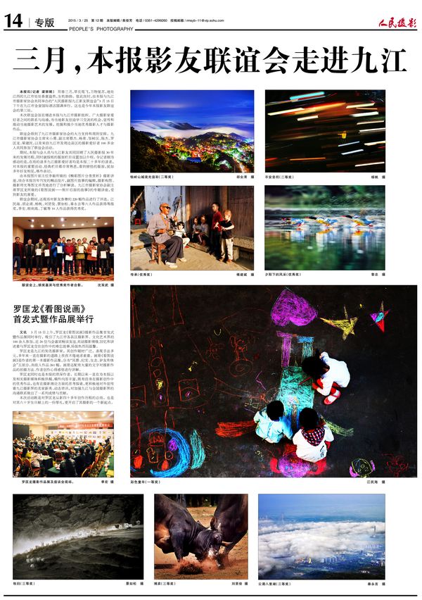 九江摄影网讯(沈双武)3月25日,《人民摄影》报14版刊登了3月15日下午九江市摄影家协会和《人民摄影》报在九江金誉国际大酒店共同举办《人民摄影》报2015年走进九江影友联谊会活动专版,报道了联谊会活动和罗匡龙《看图说画》首发式暨作品展有关情况,并择优刊发了部分获奖作品。本网特予以转载。