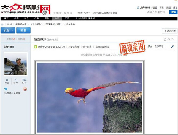 九江摄影网讯(木力)近日,由大众摄影网举办的2015俱乐部联赛5期评选结果揭晓,都昌县摄影协会副主席袁文辉的作品《凌空微步》获得一级佳作奖。