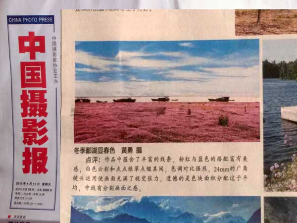 黄勇的作品《冬季鄱湖显春色》是在4月17日第15版“影廊”版发表的。在配发宁萌《待到山花烂漫时》总点评文章的同时,还对作品进行了点评。点评中说:作品中蕴含了丰富的线条,粉红与蓝色的搭配富有美感,白色云彩和点点绿草点缀其间,色调对比强烈。24mm的广角镜头运用使画面充满了视觉张力。遗憾的是色块面积分配过于平均,中线有分割画面之感。黄勇现为九江市摄协理事、都昌县摄协主席。