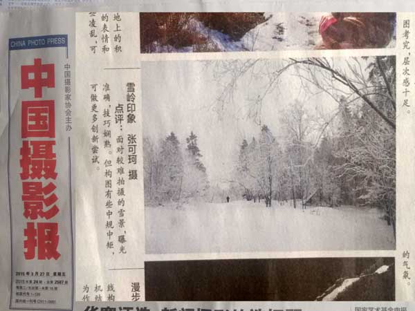 九江摄影网讯(木力)3月27日和4月17日的《中国摄影报》发表了九江作者张可珂、黄勇的摄影作品《雪岭印象》和《冬季鄱湖显春色》。 张可珂的作品《雪岭印象》是在第15版“展厅”版发表的。在配发桐华《照片的温度》总点评文章的同时,还对作品进行了点评。点评中说:面对较难拍摄的雪景,曝光准确,技巧娴熟。但构图有些中规中距,可做更多创新尝试。张可珂现为中国摄影家协会会员。这是她继去年10月24日在《中国摄影报》发表作品《西递晨曦》之后,再次在《中国摄影报》上发表作品。